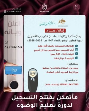 *يعلن مأتم كرزكان للنساء عن فتح باب التسجيل لدورة تعليم الوضوء للعام ١٤٤٧ هـ | ٢٠٢٥-٢٠٢٦ م* 👥 *الطالبات المسجلات للصف الأول فقط.* 📆 *أيام التدريس:* عصر الخميس . ⏰ *الوقت :* من الساعة ٣:٤٥ إلى ٥:٠٠ عصرًا. 💰 *الرسوم :٥ دينار.* ♦️ *الشروط* : ١. التسجيل للطالبات اللاتي سيلتحقن …