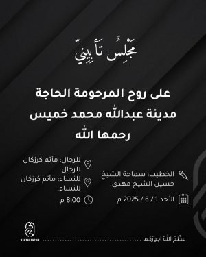◼️على روح المرحومة الحاجة مدينة عبدالله محمد خميس الخطيب: سماحة الشيخ حسين الشيخ مهدي الكرزكاني. * للرجال: مأتم كرزكان للرجال. * للنساء: مأتم كرزكان للنساء. الفاتحة المصدر: إنستغرام