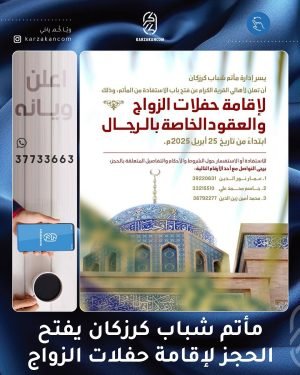 ✿ يسر إدارة مأتم شباب كرزكان أن تعلن لأهالي القرية الكرام عن فتح باب الاستفادة من المأتم ، وذلك ❝ *لإقـامـة حـفـلات الــزواج* *والعقود الخاصة بالرجال* ابتداءً من تاريخ 25 أبريل 2025م ⅏⅏⅏⅏⅏⅏⅏⅏⅏⅏ للاستفادة أو الاستفسار حول الشروط والأحكام والتفاصيل المتعلقة بالحجز ، يرجى التواصل مع أحد الأرقام التالية: ☏ …