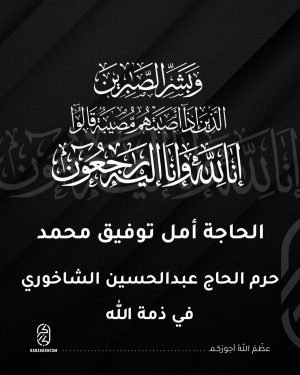 الحاجة أمل توفيق محمد، حرم الحاج عبدالحسين علي الشاخوري. اليوم الجمعة 7-3-2025 **برنامج مجالس العزاء** – **للرجال**: مأتم الإمام الحسين (ع) الشرقي . **عصرًا:** – **من 3:30 إلى 5:30**: . **ليلاً:** – **من الساعة 8:00:**: – **الخطابة الحسينية**: الساعة 10:00 مساءً. ملاحظة: لايوجد مجلس صباحي للرجال ᪥᪥᪥᪥᪥᪥᪥᪥᪥᪥᪥᪥ – **للنساء**: مأتم …