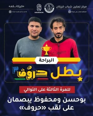 حقق الأستاذان علي حسين محفوظ وحسين علي بوحسن اللقب الثالث من مسابقة حروف بعد فوزهما مساء أمس على فريق الجبية بجولتين للاشيء.