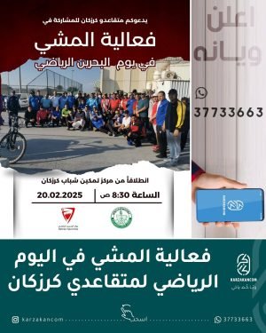 يدعوكم متقاعدو كرزكان للمشاركة في فعالية المشي بمناسبة يوم البحرين الرياضي
