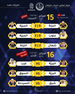 تعقد المنافسات ليليا بمركز تمكين شباب كرزكان الساعة السابعة تماما يوجد بث مباشر عن قناة «كرزكانـ.ـكمـ» على اليوتيوب المصدر: إنستغرام