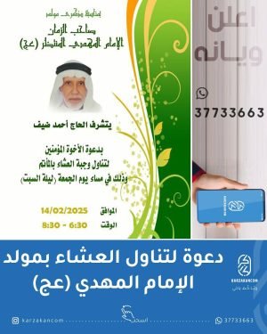 أكمل القراءة »يدعوكم الحاج أحمد ضيف لتناول طعام العشاء بمأتمه بمناسبة ذكرى مولد الإمام الحجة ابن الحسن (عج) ليلة السبت 14/2/2025 في تمام الساعة 6:30