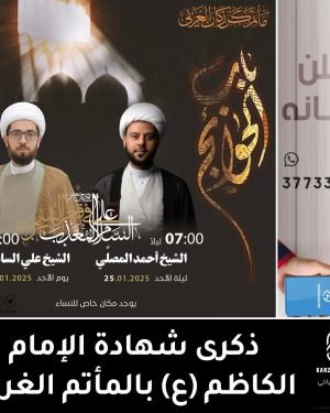 إحياء ذكرى شهادة الإمام موسى الكاظم (ع) اليوم : السبت التاريخ :25.1.2025 الوقت : بعد صلاة الظهرين مباشرة الخطيب : الشيخ حسين علي يعقوب المعاميري الرادود : السيد حسين الوداعي يهدى ثواب هذا المجلس إلى أرواح المرحومين ▪ الرجال : • الحاج عيسى علي محمد • الحاج مكي باقر علي …