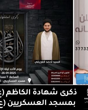 *ذكرى استشهاد الإمام الكاظم عليه السلام* 🌙 ليلة الإثنين 📅 ٢٦ / ١ / ٢٠٢٥ ⏰ الساعة ٧:٠٠ 🎙 الخطيب سماحة السيد أحمد الغريفي 🔶 للتثويب والضيافة 📲 الاتصال ابو يقين ٣٣٣٥٩٩٦٥ ابو سجاد ٣٦٤٢٢٢٠٦ ابو احمد ٣٣٨٢٠٦٤٣ *ملاحظة* • يوجد مكان خاص للنساء @alaskariyeen المصدر: إنستغرام