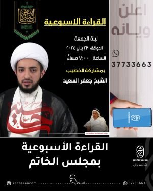 ⬅️ *مجلس المرحوم الحاج عبدالله الخاتم* وذلك في ليلة الجمعة الموافق ٢٣ يناير و ستكون القراءة ⏰ *الـسـاعة 7:00 مساءً* *بمـشاركة الـخـطـيب / الشيخ جعفر السعيد.* بعد قراءة دعاء كميل. والله ولي التوفيق. المصدر: إنستغرام