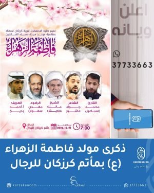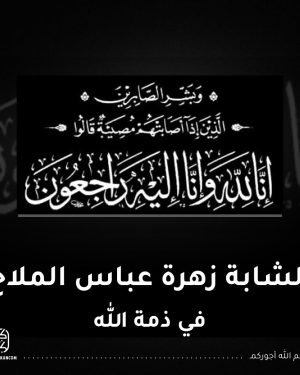 الشابة زهرة عباس الملاح، أخت كل من، المرحوم منصور وخليل وأحمد وحسين وفاضل ومحمد وعلي وعقيل. اليوم الأربعاء 18-12-2024 التشييع الساعة 10:00 صباحًا **إنا لله وإنا إليه راجعون** **برنامج مجالس العزاء لقراءة الفاتحة** # مكان الفاتحة: – **للرجال**: مأتم كرزكان للرجال. – **للنساء**: مأتم كرزكان للنساء *●أوقات التعزية للرجال..* ▪︎صباحا …
