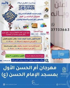 يقيم 🕌 مسجد الإمام الحسن (ع) | حي الحسن | كرزكان 📌مهرجان أم الحســـن الأول بالتعاون مع تعليم الصلاة والقرآن 🗓️ اليوم : الجمعة 📆 التاريخ : 20.12.2024 📊 الفعاليات المهرجان : سوق خيري – ألعاب للأطفال وسينما – طبق خيري ركن تصوير والعديد من الفعاليات اللعب ساعتين بـ ٣ …