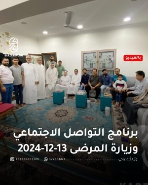 كرزكان – ليلة السبت، 13 ديسمبر 2024 في إطار برنامج التواصل الاجتماعي للجنة الاجتماعية بـ جمعية كرزكان الخيرية، نظمت اللجنة زيارات لأهالي القرية والمرضى ليلة السبت 13 ديسمبر 2024. شملت الزيارات زيارة الحاج محمد بن علي الخاتم. وقد تميزت الزيارات بالتفاعل الإيجابي والاهتمام الكبير من قبل الأهالي واللجنة. المصدر: إنستغرام