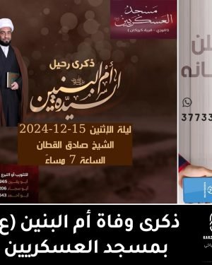 *ذكرى رحيل السيدة أم البنين عليها السلام* 🌙 ليلة الإثنين 📅 ١٥ / ١٢ / ٢٠٢٤ ⏰ الساعة ٧:٠٠ 🎙سماحة الشيخ صادق القطان للتثويب والضيافة 📲 الاتصال ابو يقين ٣٣٣٥٩٩٦٥ ابو سجاد ٣٦٤٢٢٢٠٦ ابو احمد ٣٣٨٢٠٦٤٣ ملاحظة يوجد مكان خاص للنساء @alaskariyeen المصدر: إنستغرام