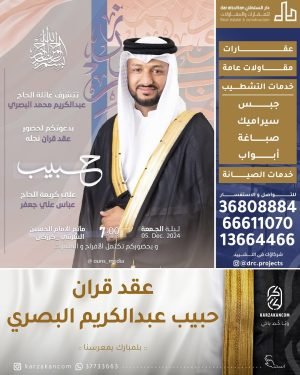 أكمل القراءة »🌺تتشرف عائلة الحاج عبدالكريم محمد البصري بدعوتكم لحضور عقد قران نجلهم *«حبيب»*، بمأتم الإمام الحسين (ع) الشرقي.