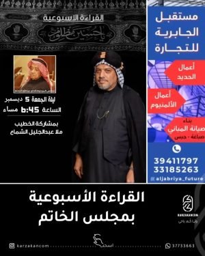 ⬅️ *مجلس المرحوم الحاج عبدالله الخاتم* وذلك في ليلة الجمعة الموافق ٥ ديسمبر و ستكون القراءة ⏰ *الـسـاعة 6:45 مساءً* *بمـشاركة الـخـطـيب / ملا عبدالجليل الشماع.* بعد قراءة دعاء كميل. والله ولي التوفيق. المصدر: إنستغرام
