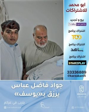 جعله الله من مواليد الخير والسعادة والبركة ورزقه برّ والديه ورضاهما،، يتربى في عزكم. _______ الإعلان 📺 ابو محمد للاشتراكات 🔻 بيع و تجديد beIN 🔻 اشتراك برنامج ToD 🔻 اشتراك برنامج شاهد 🔻 اشتراك برنامج Starzplay 33336889 @karzakani5 @karzakani5 @karzakani5 المصدر: إنستغرام
