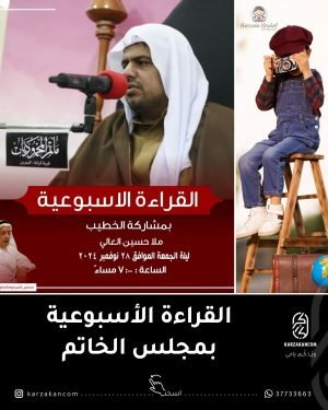 ⬅️ *مجلس المرحوم الحاج عبدالله الخاتم* وذلك في ليلة الجمعة الموافق 28 نوفمبر و ستكون القراءة ⏰ *الـسـاعة 7:00 مساءً* *بمـشاركة الـخـطـيب / ملا حسين العالي.* بعد قراءة دعاء كميل. والله ولي التوفيق. ————- الإعلان ♥️ وثق أجمل اللحظات تواصل معنا لحجز جلسة التصوير الآن على ٣٩٨٩٧٣٧٩ ستوديو حسين خلف …