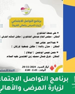 في إطار برنامج التواصل الاجتماعي للجنة الاجتماعية بـ جمعية كرزكان الخيرية، نظمت اللجنة زيارات لأهالي القرية والمرضى ليلة السبت 29 نوفمبر 2024. شملت الزيارات عيادة كل من الحاج علي جمعة الشاخوري، عبدالأمير عباس عيد وحسن عيسى أبوحسن (أبو فلاح). وقد تميزت الزيارات بالتفاعل الإيجابي والاهتمام الكبير من قبل الأهالي واللجنة. …