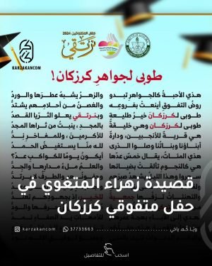 طوبى لجواهرِ كرزكان! هذي الأحبةُ كالجواهرِ تبدو والزهرُ يشبهُ عطرَها والوردُ روضُ التفوقِ أينعتْ بفروعِه والغصنُ من أحلامِهم يشتدُّ طوبى لـ(كرزكانَ) خيرُ طليعةٍ وبـ(نرتقي) يعلو الثرّيا القصدُ طوبى لـ(كرزكان) وهي خليقةٌ بالمجدِ ، ينبتُ من ثراها المجدُ هي قريةٌ للأنجبين، ودارةٌ للأكرمينَ ، وللمفاخرِ نِدُّ أبناؤنا وبناتُنا وصلوا الذرى لله …