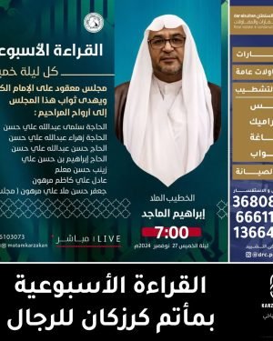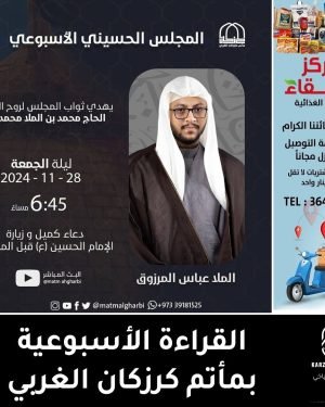 *الخطيب* : الملا إبراهيم الماجد *الوقــــت* : 7:00 مساء *اللـــيـلـة* : ليلة الخميس *المـوافق : 27/11/2024 ▪️مجلس معقود على الإمام موسى الكاظم ع ويهدى ثواب هذا المجلس إلى أرواح المراحيم : ▪️الحاجة سلمى عبدالله علي حسن ▪️الحاجة زهراء عبدالله علي حسن ▪️الحاج حسن عبدالله علي حسن ▪️الحاج إبراهيم بن حسن …
