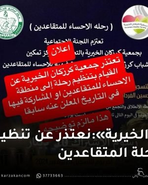 وكان الإعلان السابق دعا المتقاعدين للتسجيل في رحلة للأحساء بمبلغ 10 دنانير بتنظيم مشترك بين الجمعية الخيرية ومركز تمكين شباب كرزكان. المصدر: إنستغرام