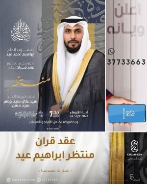 أكمل القراءة »🌺يتشرف الحاج إبراهيم أحمد عيد بدعوتكم لحضور عقد قران نجله *«منتظر»*، بمأتم الإمام الحسين (ع) الشرقي.