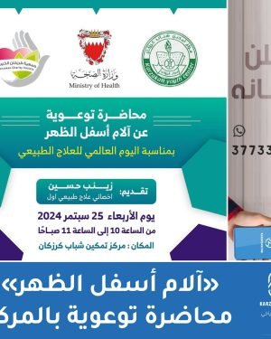 جمعية كرزكان الخيرية ومركز تمكين شباب كرزكان وبالتعاون مراكز الرعاية الصحية الأولية – قسم العلاج الطبيعي تقدمان محاضرة توعوية عن الام اسفل الظهر بمناسبة اليوم العالمي للعلاج الطبيعي وذلك يوم الاربعاء الموافق 25 سبتمبر 2024 في تمام الساعة العاشرة صباحا بمركز تمكين شباب كرزكان @karzakancharity @mys_yc_karzakan المصدر: إنستغرام