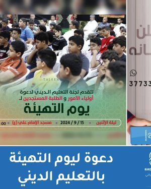 لجنة التعليم الديني – كرزكان تتقدم لجنة التعليم الديني لدعوة أولياء الأمور والطلبة ليوم تهيئة الطلبة المستجدين لصف أول إعدادي مسجد الإمام علي (ع) 7:15 م ليلة الإثنين 15-9-2024 @taleemdk المصدر: إنستغرام
