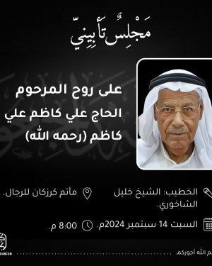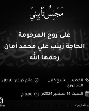 مجلس تأبيني على روح المرحومة الحاجة زينب علي محمد أمان (أم علي عبدالرضا المهدي)، مساء يوم السبت الموافق 14/9/2024.
