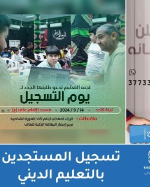 الطلبة المتخرجين من تعليم القرآن “المنتقلين للصف الأول الإعدادي” لـ يوم التسجيل 📅 ليلة الأحد 14-9-2024 مسجد الإمام علي [ع] 7:15 م # ملاحظات – الرجاء اصطحاب ابنكم ليتم أخذ صورة شخصية له. – الرجاء إحضاء البطاقة الذكية @taleemdk المصدر: إنستغرام