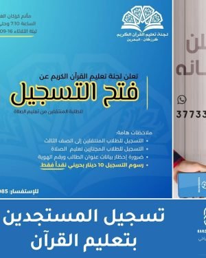 يوم التسجيل لجنة تعليم القرآن تدعو طلبتها الجدد الطلبة المتخرجين من تعليم الصلاة “المنتقلين للصف الثالث الابتدائي” لـ يوم التسجيل 📅 ليلة الثلاثاء 16-9-2024 مأتم كرزكان الغربي 7:10 م *ضرورة احضار البطاقة الشخصية وعنوان الطالب* *رسوم التسجيل 10 دنانير نقدا فقط* @tquran المصدر: إنستغرام