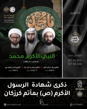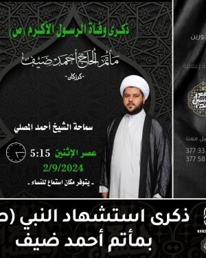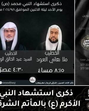 ┈╾۞ *ذكــــرىٰ اســـتشـھـاد* ┈╾۞ *الرسول الأعظم ’ص‘* ⌯ الأحــد 01 – 9 – 2024 م ۞ موكب أبناء الطف (للأشبال) ≣ الرادود علي المحرقي ≣ 08:15 مساءً ۞ الخطابة الحسينية ≣ الشيخ بشار العالي ≣ 09:00 مساءً ۞ الموكب العزائي ≣ الرادود السيّد حسين الموسوي ≣ 10:00 مساءً ┈━ •۞[ …