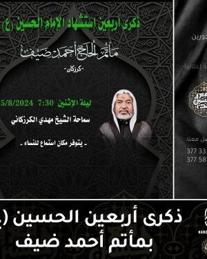 وذلك ليلة الثلاثاء الموافق 26/8/2024 في مسجد الامام الحسن عليه السلام وقد بدأت الفعالية بترحيب عريف الحفل الاستاذ زهير ايوب وذلك بترديد دعاء الفرج تلتها فقرة القران الكريم للطالب محمد جاسم الفردان ثم فقرة عرض تلفزيونيه توضح قصة الاربعين وبعدها كلمة هادفة بالمناسبة للاستاذ القدير علي يوسف واختتمت بفقرة عزائية …