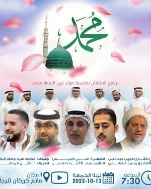 ﻣأﭠم ﻛرزﻛٱن ﻟﻟرﺟٱل .. ≣ نبارک لكم ذكرى ولادة .. ≣≣ *نبي الرحمه محمد بن عبدالله ‘ص’* *وبھذه المناسبة تقيم اللجنة الثقافية برنامجھا المنوع:* ❉ العــريف: *أ. عقيل المدهون* ❉ القــــرآن: *القارئ حبيب عبدالنبي* ❉ الكلمــــة: *الشيخ محمد الشھابي* ❉ الشــــعر: *الشاعر أ. علي خميس* ❉ النشـــيد: *فرقة أصداء الغدير* …