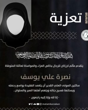 ‘ ▞ ﻣأﭠم ﻛرزﻛٱن ﻟﻟرﺟٱل بسم ٱلله الرَّحْمٰنِ الرَّحِيـمِ {كُلُّ نَفْسٍ ذَآئِقَةُ الْمَوْتِ وَإِنَّمَا تُوَفَّوْنَ أُجُورَكُمْ يَوْمَ الْقِيَامَةِ فَمَن زُحْزِحَ عَنِ النَّارِ وَأُدْخِلَ الْجَنَّةَ فَقَدْ فَازَ وَما الْحَيَاةُ الدُّنْيَا إِلاَّ مَتَاعُ الْغُرُورِ } صدق الله العلي العظيم يتقدم مأتم كرزكان للرجال بخالص العزاء والمواساة لعائلة “المرحومة الحاجة نصرة علي يوسف” سائلين المولى العلي …