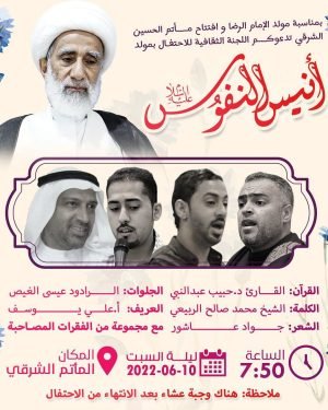 ‘ نبارك لكم ذكرى ولادة: *💐 الإمام الرضا ‘ع’ 💐* وبهذه المناسبة وبمناسبة افتتاح مأتم الحسين الشرقي تقيم *اللجنة الثقافية* برنامجها المنوّع: – العريف: أ. علي يوسف – القرآن: القارئ د. حبيب عبدالنبي – الكلمة: الشيخ محمد صالح الربيعي – الشعر: جواد عاشور – الجلوات: الرادود عيسى الغيص – مع …