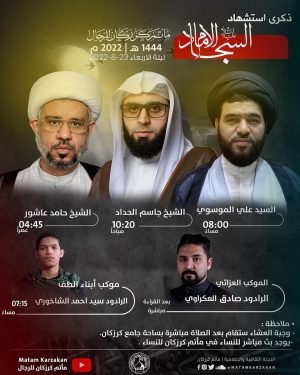 ۩ ﻣأﭠم ﻛرزﻛٱن ﻟﻟرﺟٱل .. ذكرىٰ إستشھاد ♦️ الإمام السجاد ‘ع’ ♦️ ١٤٤٤ھ – ٢٠٢٢م 🏴 برنامج إحياء ذكرىٰ إستشھاد الإمام علي بن الحسين ‘ع’ ⌭ لـيــــــلاً 🎙️ السـيّد عــلي الموسوي ⏰ 8:00 مساءً ⌭ الموكب العزائي 🎙️ الرادود صادق العكراوي بعد القراءة مباشرة ⌭ موكب أبناء الطف 🎙️ الرادود …