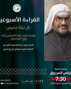 ‘ ▞ ﻣأﭠم ﻛرزﻛٱن ﻟﻟرﺟٱل *⌯ القراءة الأسبوعية ⌯* ↲ *الخطيب*: الملا إلياس المرزوق ↰ *الـوقـــت*: 7:30 مساءََ ↲ *اللــــيلـة*: ليلة الخميس ↰ *المـوافق*: 04/05/2022 يهدى ثواب المجلس إلى روح المراحيم: ⇽ الحاج حبيب عبدالمحسن الفردان. ⇽ الحاجة نصرة سلمان آل إبراهيم. ۞ رحم الله من قرأ لأرواحھم سورة الفاتحة …