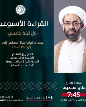 ‘ ⌯ القراءة الأسبوعية ⌯ ↲ الخطيب: الشيخ علي سديف ↰ الـوقـــت: 7:45 مساءََ ↲ اللــــيلـة: ليلة الخميس ↰ المـوافق: 11/05/2022 يهدى ثواب المجلس إلى روح المراحيم: ⇽ الحاج ربيع المعلم. ⇽ الشهيد فاضل عباس. ⇽ الحاجة مكية( أم الحاج ربيع ). ⇽ الحاج محمد المعلم. ۞ رحم الله من …