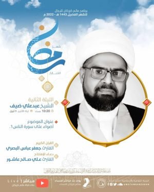 ‘ ﻣأﭠم ﻛرزﻛٱن ﻟﻟرﺟٱل ☾ ◑ مواضيع وأبحاث الخطيب الشيخ عبدعلي ضيف للنصف الأول من شهر رمضان الفضيل: ١: وقفات على آية الصوم . ٢: أضواء على سورة الناس١. ٣: أضواء على سورة الناس ٢. ٤: يونس بن متَّى (ع) .. لفتات قرآنية . ٥: لقمان الحكيم ، نبي أم …