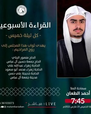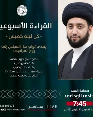 ‘ ⌯ القراءة الأسبوعية ⌯ ↲ الخطيب: السيد هادي الوداعي ↰ الـوقـــت: 7:45 مساءََ ↲ اللــــيلـة: ليلة الخميس ↰ المـوافق: 30/03/2022 ويهدى ثواب المجلس إلى أرواح المراحيم: ⇽ الحاج حسن حبيب محمد ⇽ هبة حسن حبيب ⇽ زهراء حسن حبيب ⇽ نجيبة سيد محمد سيد محفوظ ⇽ الحاج علي حبيب …