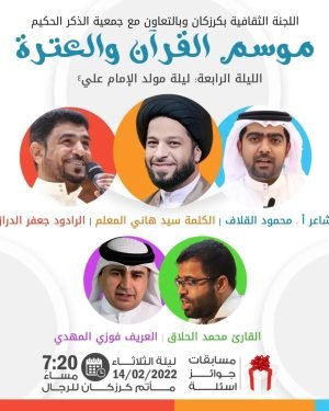 ‘ ۩ ﻣأﭠم ﻛرزﻛٱن .. تتواصل فعاليات *موسم القرآن والعترة* والتي تقيمه اللجنة الثقافية – الإعلامية بالتعاون مع جمعية الذكر الحكيم 🔹الليلة الرابعة: *مولد أمير المؤمنين علي عليه السلام * 💐 ┑ *العرافة*: فوزي المهدي ┥ *القرآن*: القارىء محمد الحلاق ┥ *الكلمة*: سيد هاني المعلم ┥ *الشاعر*: أ. محمود القلاف …