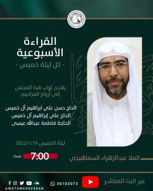 ‘ ۩ ﻣأﭠم ﻛرزﻛٱن .. *« القراءة الأسبوعية »* *الخطيب* : الملا عبدالزهراء السماهيجي *الـوقـــت* : 7:00 مساءََ *اللــــيلـة* : ليلة الخميس *المـوافق* : 19/1/2022 يھدى ثواب هذا المجلس إلى أرواح المراحيم: ▪️الحاج حسن علي إبراهيم آل خميس ▪️الحاج علي إبراهيم آل خميس ▪️ الحاجة فاطمة عبدالله عيسى الفاتحة 📺 …