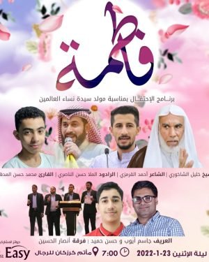 ‘ ۩ ﻣأﭠم ﻛرزﻛٱن .. اللجنة الثقافية 💐 *نبـارک لكم ذكرىٰ مولد سيدة* 💐 *نساء العالمين فاطمة الزهراء* 💐 *عليھا السلام ..* ⁌ تقيم اللجنة الثقافية برنامجھا المنوّع ┑ *الـعــــريف:* جاسم أيوب وحسن حميد ┥ *الـقــــــرآن:* القـارئ محمد حسن المدهون ┥ *الـكلـمـــــة:* الشيخ خليل الشاخوري ┥ *الـشـــــعـر:* الشاعـر أحمد القرمزي …