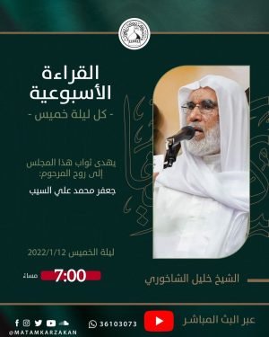 ‘ ۩ مأتم كرزكان .. تغطية مصورة: القراءة الأسبوعية بمشاركة الخطيب #الشيخ_خليل_الشاخوري ، ليلة الخميس الموافق 12/01/2022 يھدى ثواب هذا المجلس إلى روح المرحوم: ▪️جعفر محمد علي السيب الفاتحة المصدر