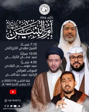 ‘ ۩ مأتم كرزكان .. ❃ ذكرىٰ وفاة ❃ *.. « أم البنين (ع) » ..* ⇜ مساءً ٧:١٥ ┙ *الشيخ مهدي الكرزكاني* ↓ 🗓️ *ليلة الإثنين ٢٠٢٢/١/١٦* ⇜ صباحًا ١٠:٠٠ ┙ *سيد عدنان الكراني* ↓ 🗓️ *صباح الإثنين ٢٠٢٢/١/١٧* عصرًا ٤:٠٠ ┙ *سيد موسى البلادي* ↓ 🗓️ *عصر الإثنين …
