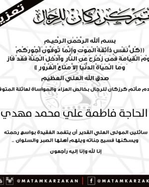 ‘ بسم ٱلله الرَّحْمٰنِ الرَّحِيـمِ {كُلُّ نَفْسٍ ذَآئِقَةُ الْمَوْتِ وَإِنَّمَا تُوَفَّوْنَ أُجُورَكُمْ يَوْمَ الْقِيَامَةِ فَمَن زُحْزِحَ عَنِ النَّارِ وَأُدْخِلَ الْجَنَّةَ فَقَدْ فَازَ وَما الْحَيَاةُ الدُّنْيَا إِلاَّ مَتَاعُ الْغُرُورِ } صدق الله العلي العظيم يتقدم مأتم كرزكان للرجال بخالص العزاء والمواساة لعائلة المتوفاة “المرحومة الحاجة فاطمة علي محمد مهدي” سائلين المولى العلي القدير أن …