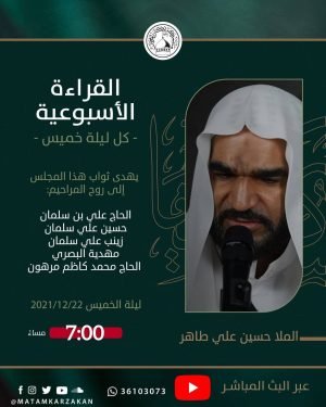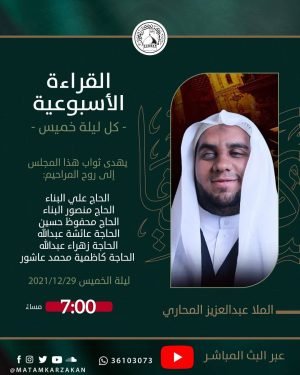 ‘ ۩ مأتم كرزكان .. *« القراءة الأسبوعية »* *الخطيب* : الملا عبدالعزيز المحاري *الـوقـــت* : 7:00 مساءََ *اللــــيلـة* : ليلة الخميس *المـوافق* : 29/12/2021 يھدى ثواب هذا المجلس إلى أرواح المراحيم: ▪️الحاج علي البناء ▪️الحاج منصور البناء ▪️الحاج محفوظ حسين ▪️الحاجة عائشة عبدالله ▪️الحاجة زهراء عبدالله ▪️الحاجة كاظمية محمد …