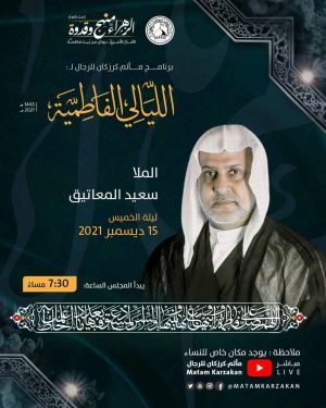 ‘ ۩ ﻣأﭠم ﻛرزﻛٱن .. برنامج مأتم كرزكان للرجال .. *.. « اللّيَالِيْ الفَاطِميَّةْ » ..* ⇜ لـيــــــلاً ٧:٣٠ ┙ المجلس *الملا سعيد المعاتيق* ↓ 🗓️ *ليلة الخميس ٢٠٢١/١٢/١٥* ⇜ ملاحظة: *يوجد مكان خاص للنساء* 📺 *الـبـث المباشر على قناة* *مـأتم ڪرزڪان للرجال* http://youtube.com/MatamKarzakan/live ━─┄─━─┄─━─┄─━─┄─━ إﺷـ̅͠ﭠرک ﻟﯾﺻـﻟک ﺟدﯾدﻧـٱ – …