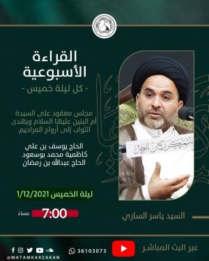 ‘ تغطية مصورة: القراءة الأسبوعية الخطيب السيد ياسر الساري، ليلة الخميس الموافق 1/12/2021 مجلس معقود على السيدة أم البنين عليها السلام ويهدى الثواب إلى أرواح المراحيم الحاج يوسف بن علي كاظمية محمد بوسعود الحاج عبدالله بن رمضان الفاتحة المصدر