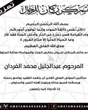 ‘ بسم ٱلله الرَّحْمٰنِ الرَّحِيـمِ {كُلُّ نَفْسٍ ذَآئِقَةُ الْمَوْتِ وَإِنَّمَا تُوَفَّوْنَ أُجُورَكُمْ يَوْمَ الْقِيَامَةِ فَمَن زُحْزِحَ عَنِ النَّارِ وَأُدْخِلَ الْجَنَّةَ فَقَدْ فَازَ وَما الْحَيَاةُ الدُّنْيَا إِلاَّ مَتَاعُ الْغُرُورِ } صدق الله العلي العظيم يتقدم مأتم كرزكان للرجال بخالص العزاء والمواساة لعائلة المتوفى “المرحوم عبدالجليل محمد الفردان” سائلين المولى العلي القدير أن يتغمد الفقيد …