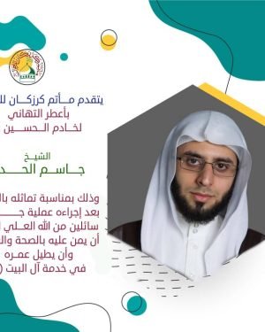 ‘ يتقدم مأتم كرزكان للرجال بأعطر التهاني لخادم الإمام الحسين عليه السلام سماحة الشيخ جاسم الحداد..وذلك بمناسبة تماثله بالشفاء بعد إجراءه عملية جراحية.. سائلين من الله العلي القدير أن يمن عليه بالصحة والعافية وأن يطيل عمره في خدمة آل البيت عليهم السلام. المصدر
